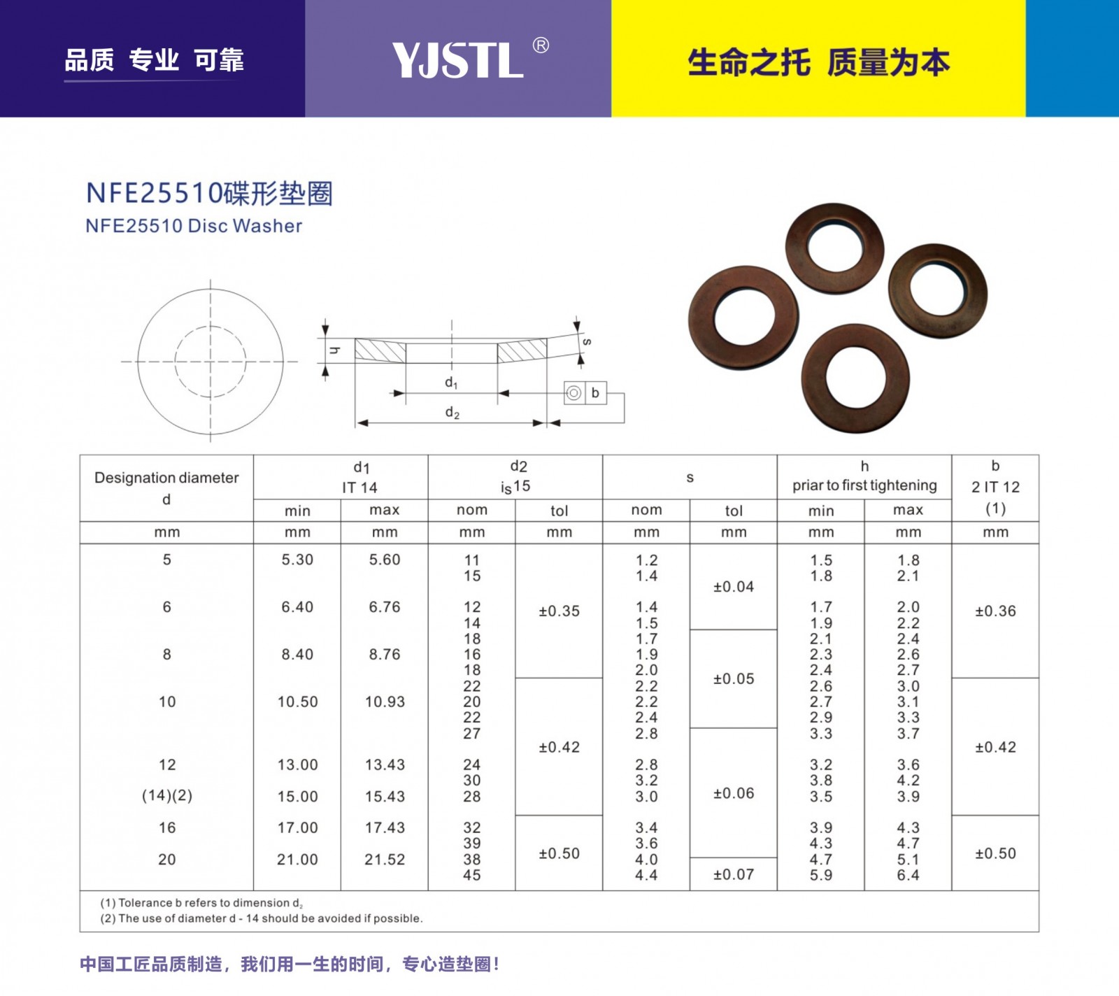 制造執行標準:符合NFE25510與DIN6796-HS標準。規格:M5-M20型號,也可提供訂制服務主要材質有S60C,60Si2mn,51crav4及特殊合金材質,鹽浴硬化,表面處理為磷化黑,機械鋅,達克羅涂層等!不提供化學電鍍處理!多數情況下標準型碟形彈簧墊圈并不能完全滿足用戶要求,通過計算與適當調整來獲得理想的訂制功能!